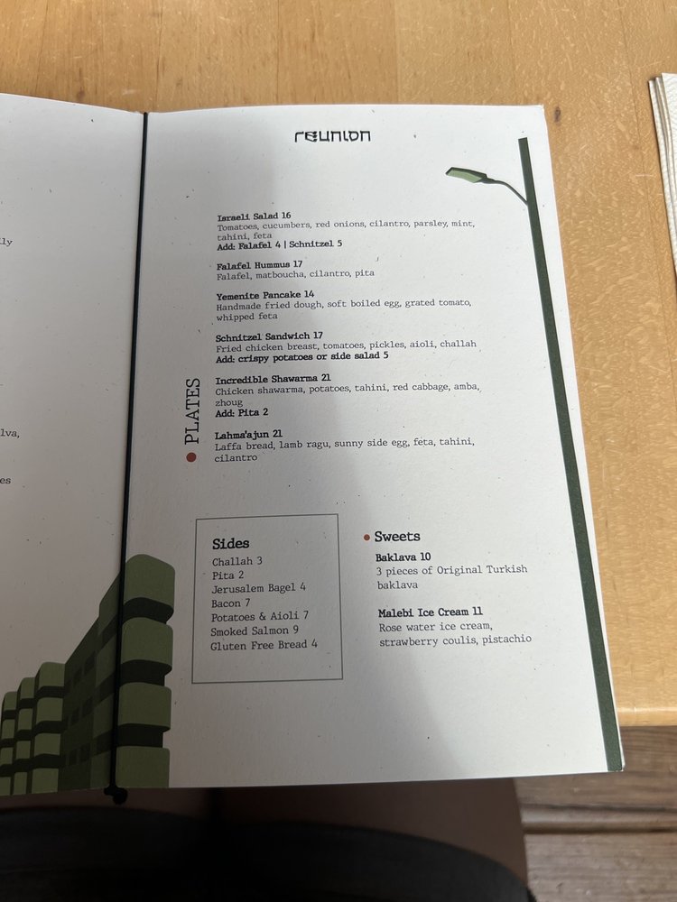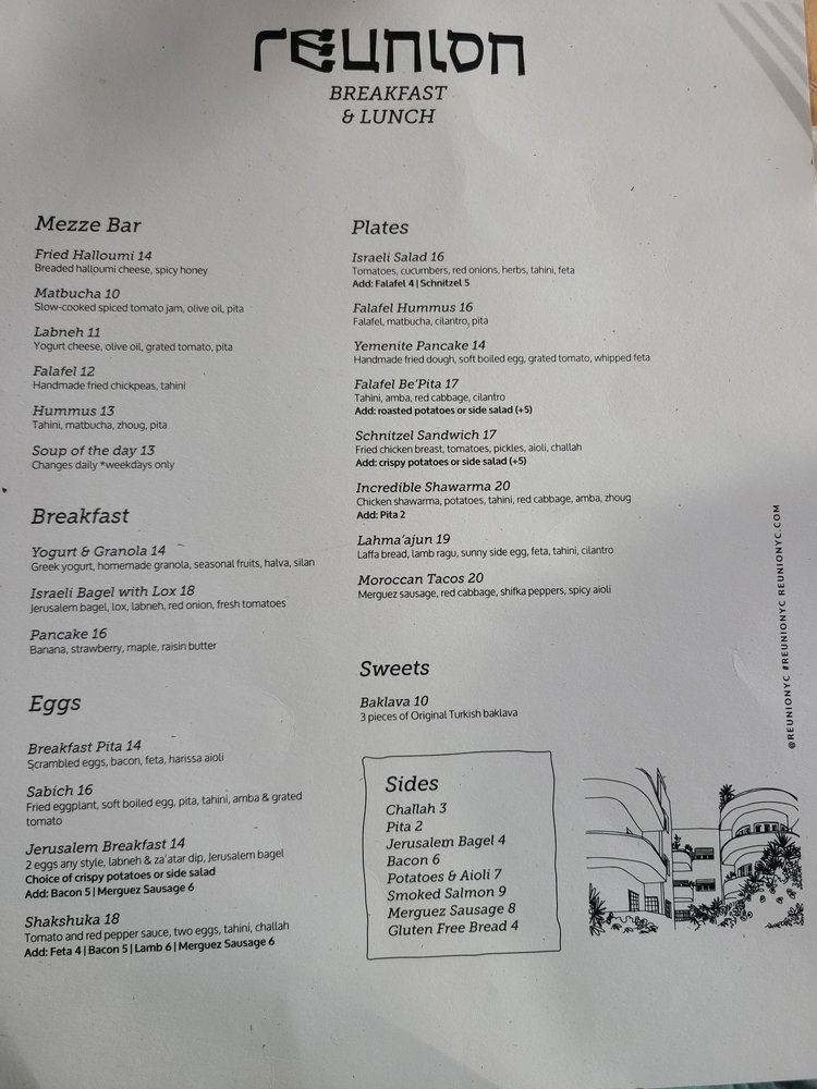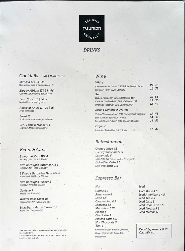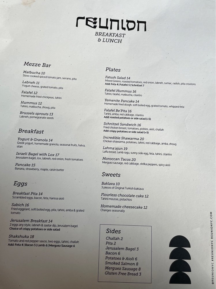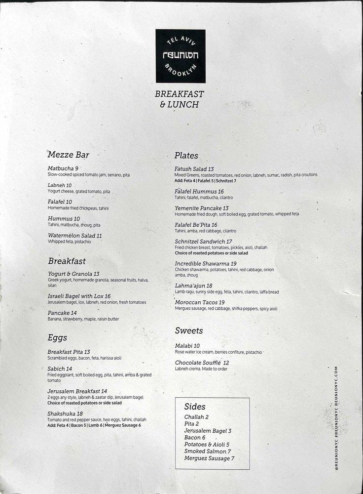 Reunion, located in Brooklyn, NY, is a vibrant spot offering Breakfast & Brunch, Cocktail Bars, and Middle Eastern cuisine. With a diverse menu that includes vegan and vegetarian options, outdoor seating, and a full bar, this hipster, trendy restaurant is a must-visit. Customers rave about the fresh and delicious dishes, such as the hummus, shakshuka, and labneh. The friendly staff and excellent service create a welcoming atmosphere for diners. Highlights include the crispy falafels, spicy honey dip with halloumi, and flavorful lamb sausages. Whether you're looking for a casual brunch or a unique dining experience, Reunion has something for everyone. Don't miss out on trying their signature cocktails and mouthwatering Israeli salads. Experience the taste of reunion at this gem of a restaurant.